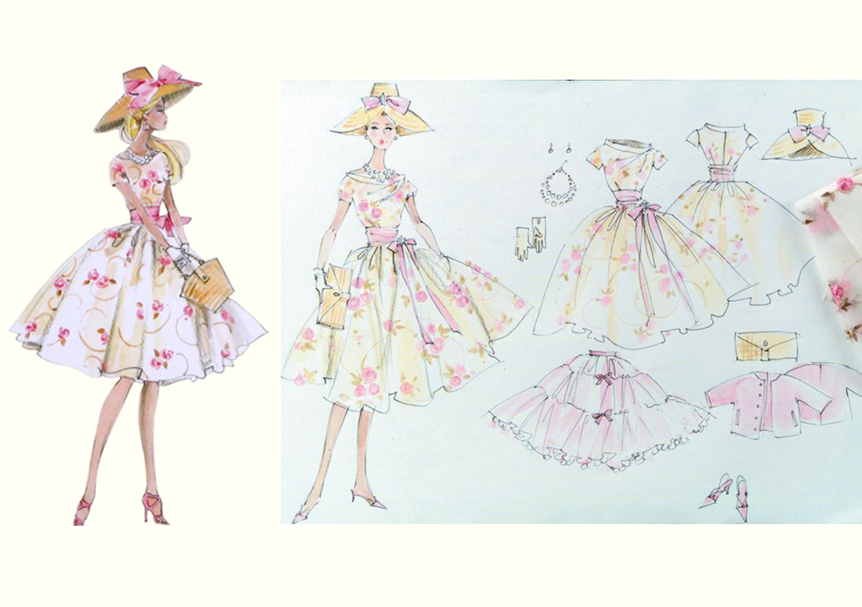 Delphine™ Barbie® doll embodies the ultimate expression of style and elegance in a strapless evening gown in pale turquoise taffeta with a dramatic bow, draped train, and delicate pink flower accents. Her white faux fur stole lined in pink satin gives her stunning ensemble the final glamorous touch.