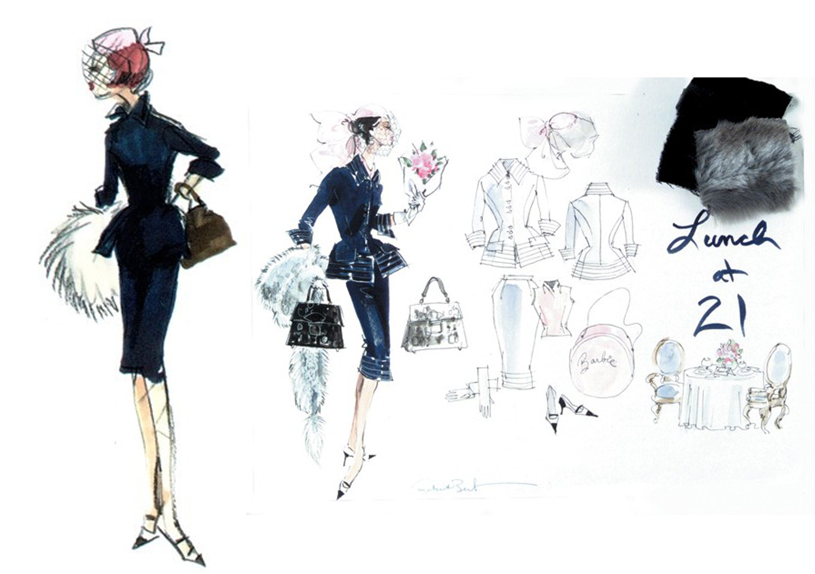 A sophisticated ensemble, featuring a navy suit, pink halter bodysuit, gray faux fur stole with pink satin lining, pillbox hat, black “patent” handbag, bouquet of pink roses and white gloves.