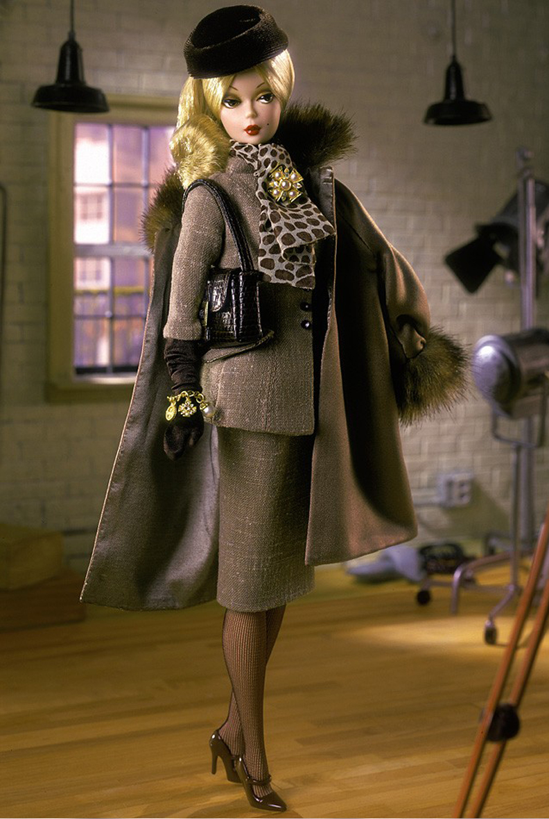 Always front row, this industry insider all but steals the show. Wearing a stylish black coat atop a basic black shirt, leopard print skirt, black stockings and hip shoes, Barbie® doll is dressed to impress. Unique black eyeglasses, matching hair ribbon, and stylish purse complement this fashionable ensemble. Style is a serious business to this well dressed editor.