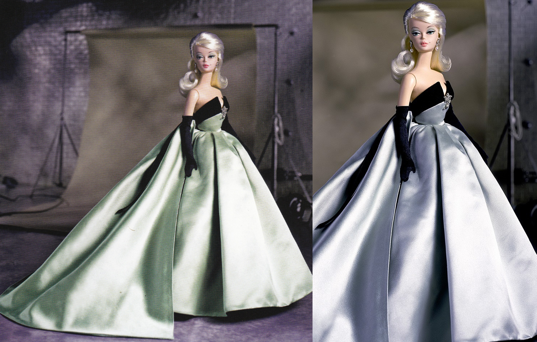 Barbie® looks elegant in this pale mint green strapless gown with black accents. This fabulous color accentuates Barbie® doll’s light green eyes and pale pink lips. A cape attaches to the back of her gown and features black ribbon detailing. Underneath her dress, Barbie® wears a black tulle petticoat and black pantyhose. Long black gloves, black Mary Jane heels, and faux pearl and rhinestone jewelry complete the ensemble. Barbie® doll’s platinum hair is pulled back with a black bow.