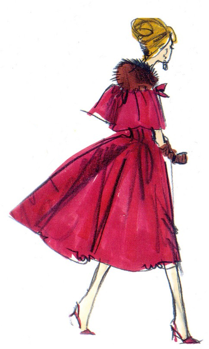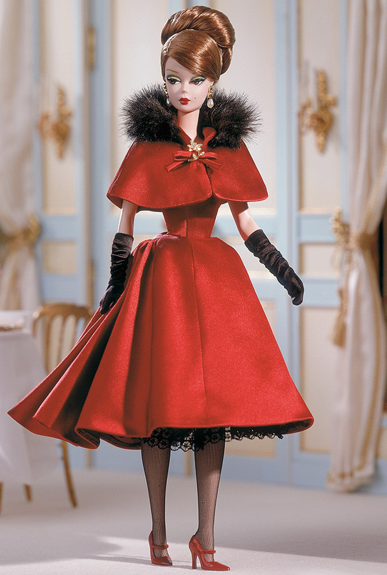 Barbie® looks elegant in her full-skirted crimson satin dress and matching cape trimmed in faux sable. A black lace petticoat enhances the flair and flirt of the skirt, while the subtle sparkle of golden and rhinestone jewelry add sleek panache to this already sensational party ensemble.