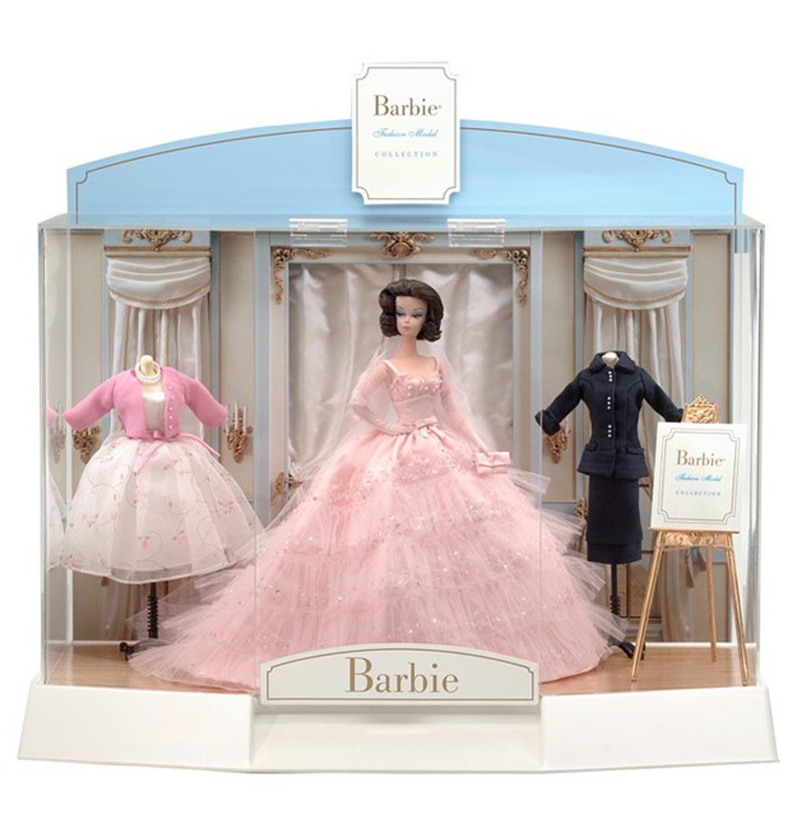 “This case was provided to select dealers selling the 2000 Barbie Fashion Model Collection. Both the blue sign atop the case and the front panels of the case say “Limited Edition.” The front middle panel is hinged for ease in arranging the two fashion mannequins and the easel with sign in front of the glamorous ballroom backdrop. A plastic holder containing 50 Barbie Fashion Model Collection booklets could be placed beside the case. Note the lower middle panel of the case which introduces customers to the features of the new Silkstone Lingerie Barbie dolls. “ –from Collectors Encyclopedia of Barbie Dolls 2008 Edition by J. Michael Augustyniak