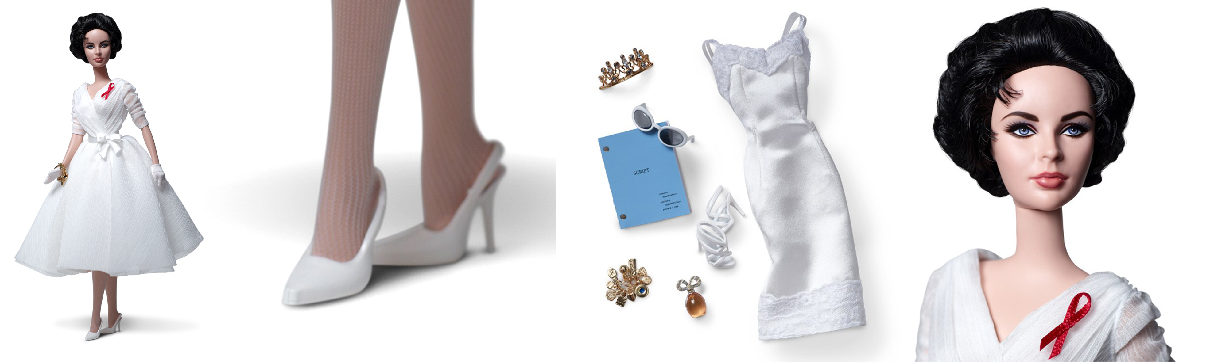 Elizabeth Taylor forever represents timeless glamour and a maverick spirit. Crafted in magnificent detail, the doll’s face sculpt was reviewed and approved by Elizabeth Taylor herself. She wears a timeless satin dress with matching opera gloves and pumps, rhinestone brooch, bracelet and earrings. Also includes sunglasses and a mini “perfume” bottle. A tiny red ribbon near her shoulder represents her commitment to battling HIV/AIDS.