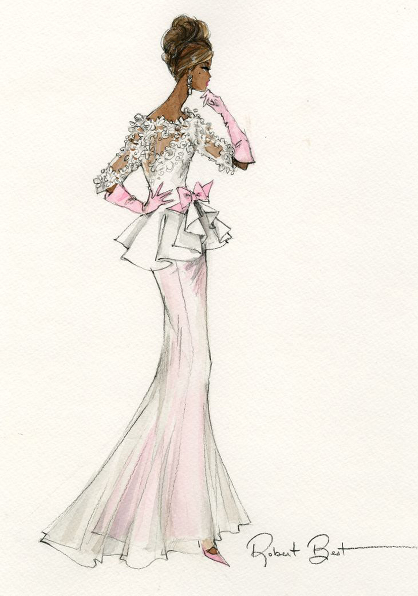Direct from the atelier, her feminine ensemble features an embroidered white top embellished with white beads, clear iridescent sequins and silk ribbon flowers, while a pink satin bow accents the cinch-waist. Her sheer white overskirt gently reveals a pink satin flared skirt, and alluring accouterments include pink opera gloves and cross strap shoes. For an elegant final touch, she adds silvery rhinestone floral earrings with faux pearl drop.