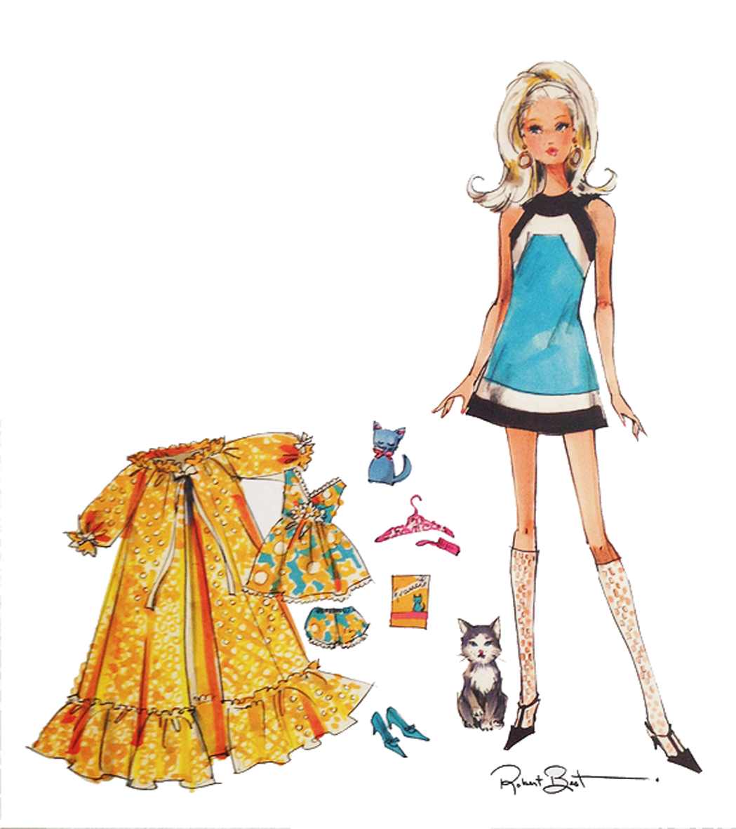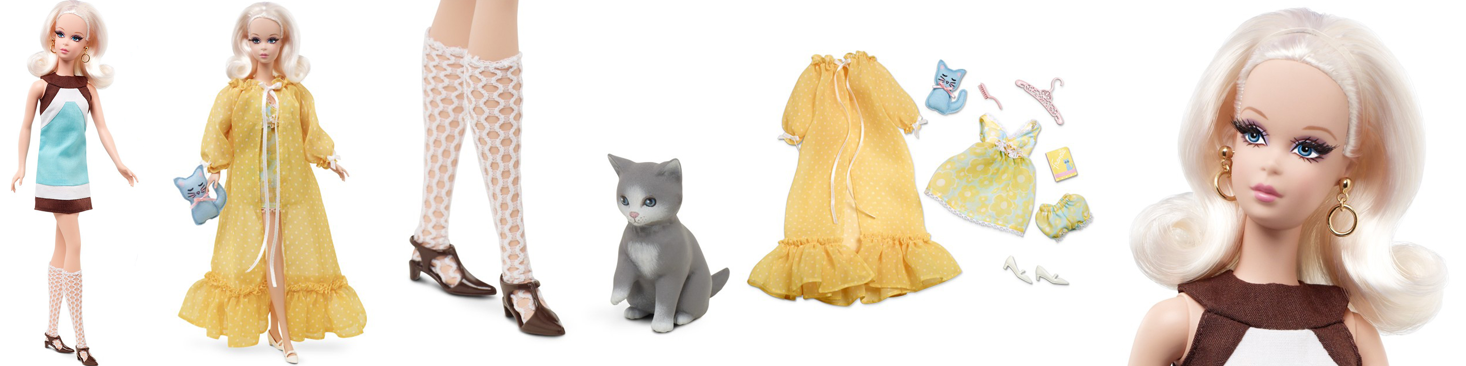 Francie Fairchild is Barbie doll’s fun and fabulous cousin. Fresh as a daisy and fancy free, she’s back again and she’s looking sharp! Dressed in a bold, 60s-inspired shift, she comes with a dreamy nighttime fashion, perfect for cuddling up with her kitten, Slippers™. Her whimsical style returns, modeled on a Silkstone body—so MODern!