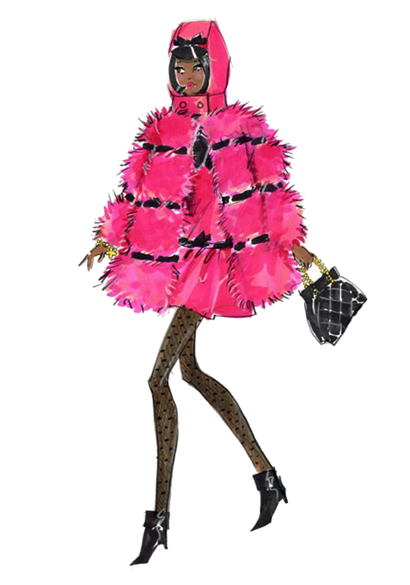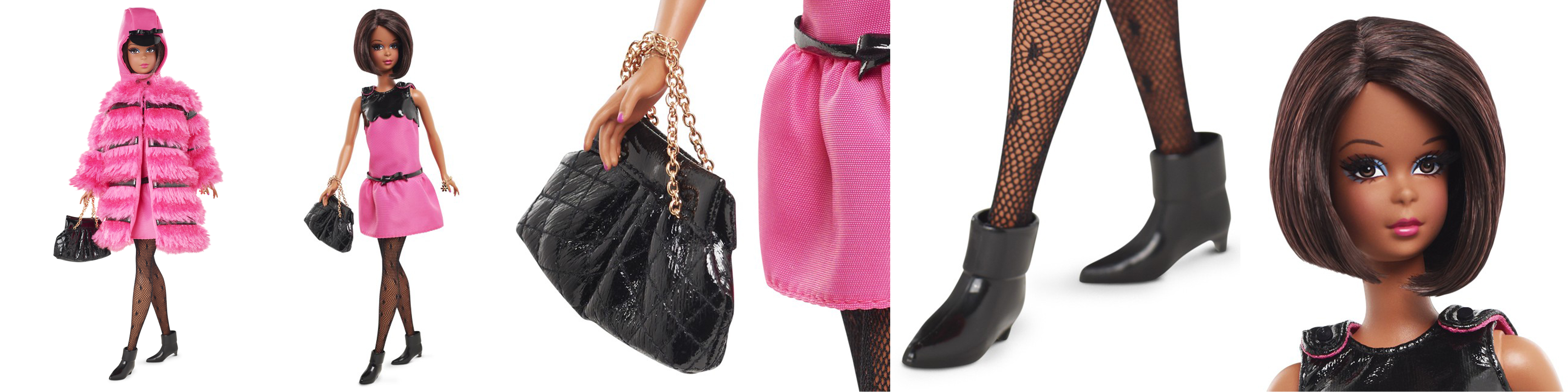 Francie Fairchild is Barbie doll’s fun and fabulous cousin. Fresh as a daisy and fancy free, she’s back again, dressed in pink! Faux fur coat featuring black vinyl trim covers a sleeveless faille mini dress. We’ve missed her whimsical style and now, for the first time ever, Barbie Collector presents an African-American Francie with Silkstone body—so MODern!