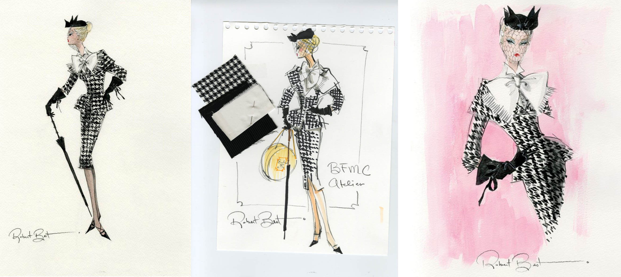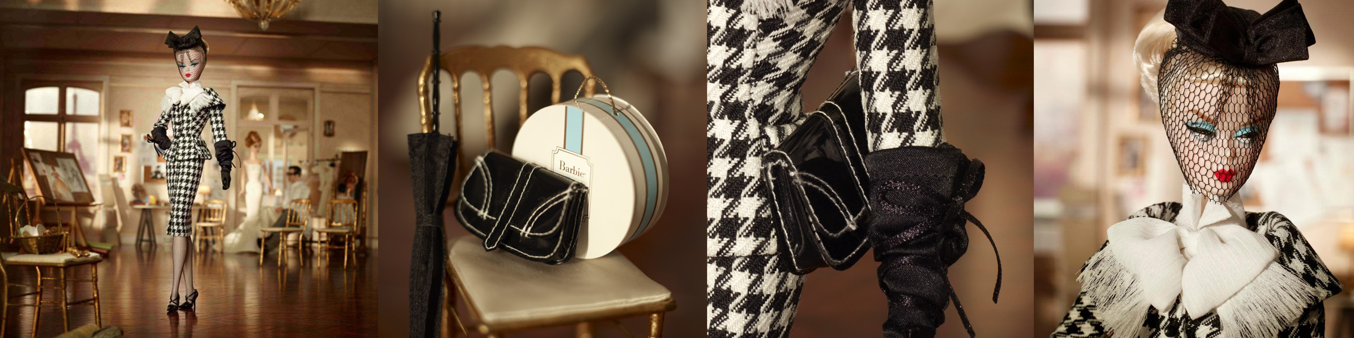 Stylishly attired for a day out and about, Walking Suit Barbie® wears a finely tailored black-and-white houndstooth suit featuring a cinch-waist jacket and pencil skirt. A crisp white collar and bow accentuate the neckline. Impeccable accessories include a black veiled hat, purse, stilettos, stockings and umbrella.
